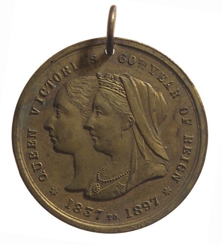 Other Details: Queen Victoria's diamond jubilee in 1897 was celebrated the great enthusiasm throughout the British Empire. It prompted many Australian local governments to issue commemorative medals. This gilt medal features conjoined young head and veiled bust of Queen Victoria on the obverse and the Advance Australia Arms on the reverse.