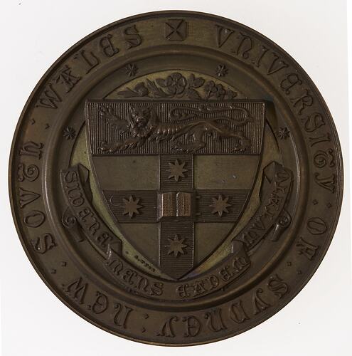 At centre, University Crest with motto below on ribbon SIDERE MENS EADEM MVTATO; artist's name., A.WYON in tiny letters beside shield; around on broad rim, + UNIVERSITY : OF : SYDNEY : NEW : SOUTH : WALES