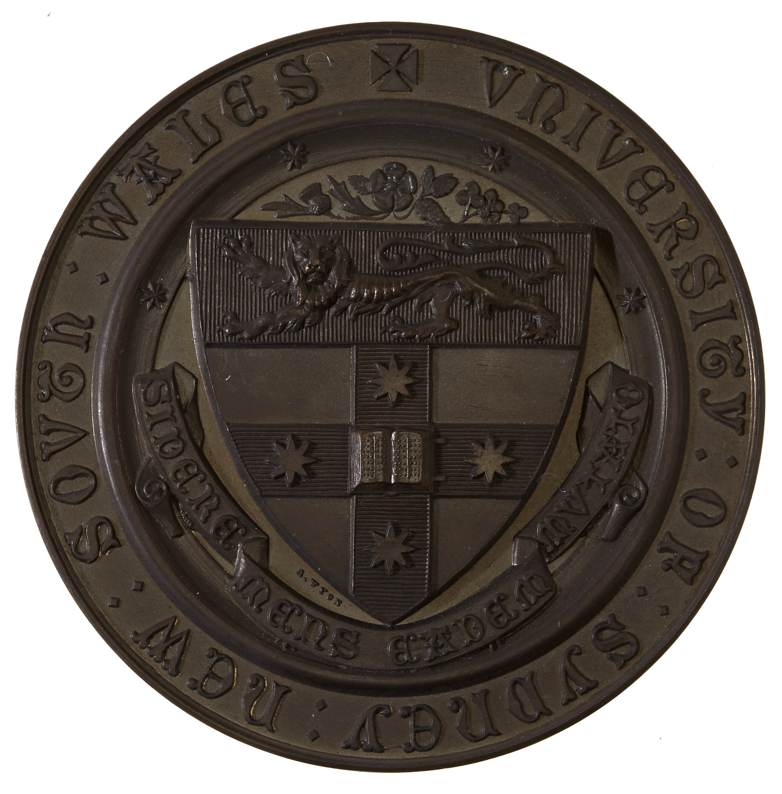 At centre, University Crest with motto below on ribbon SIDERE MENS EADEM MVTATO; artist's name., A.WYON in tiny letters beside shield; around on broad rim, + UNIVERSITY : OF : SYDNEY : NEW : SOUTH : WALES