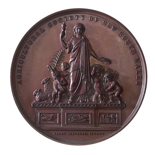 New South Wales, standing facing, holding a lit torch and a Victor's wreath, around her four children harvest wheat, carry grapes and; below on three panels art, agriculture and industry are representeed. tend sheep; around above, AGRICULTURAL SOCIETY OF NEW SOUTH WALES in small letter below HARDY BROTHERS LONDON & SYDNEY