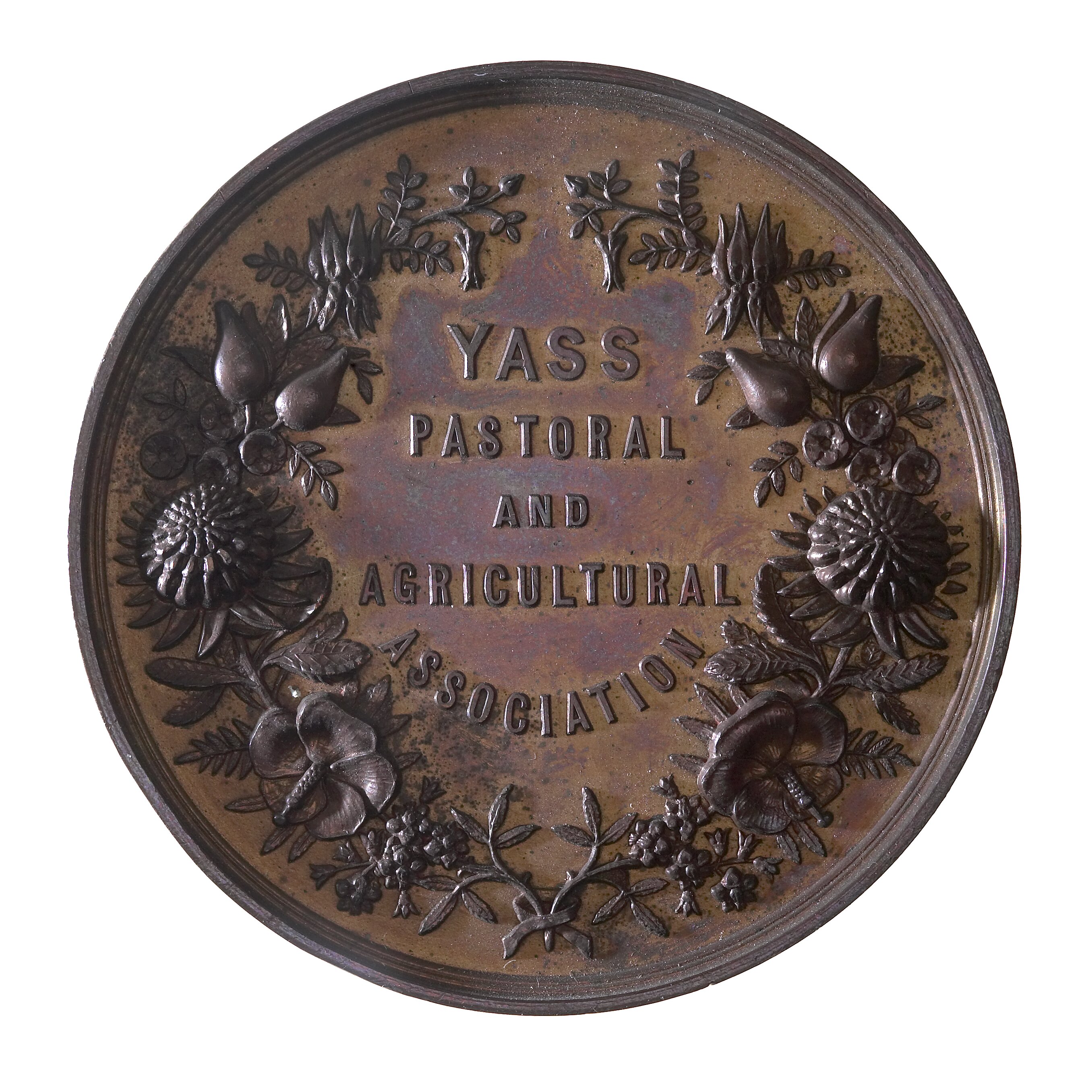 Obverse: YASS PASTORAL AND AGRICULTURAL ASSOCIATION Wreath of Australian native flora Reverse: PALMAM QUI MERUIT FERAT/HARDY BROS. Wreath, blank central circle for engraving