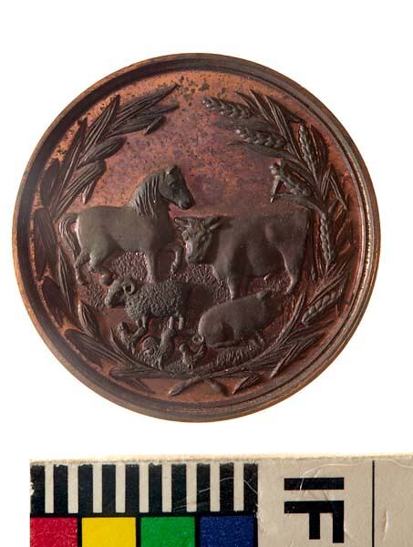 An unissued bronze prize medal (31 mm diameter) featuring a horse, bull, sheep, pig and chickens within a wreath of wheat and corn together with detailsd of the issuing Association and space for engraving details of a prize.