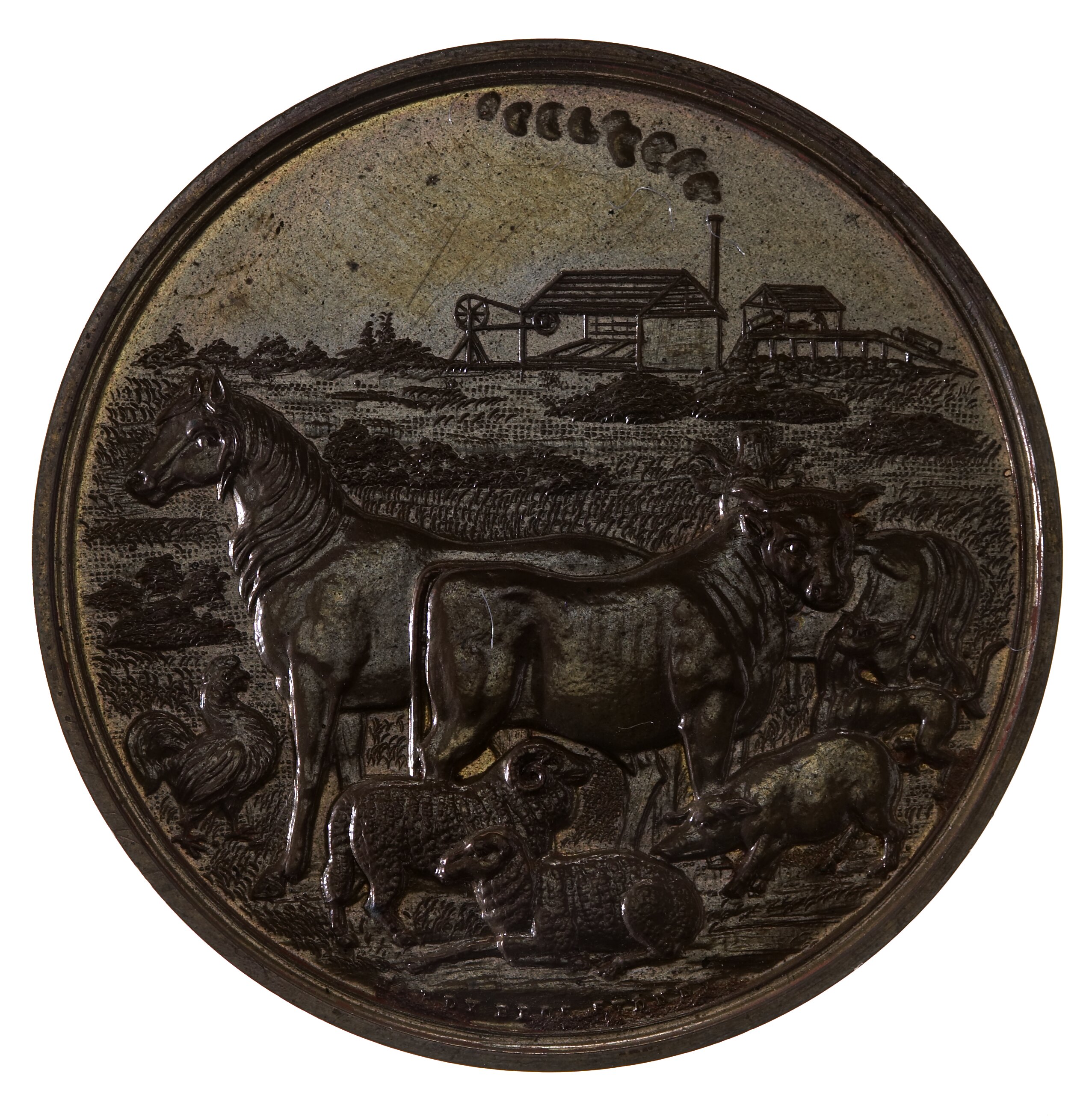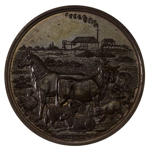 An unissued bronze prize medal (48 mm diameter) featuring a rural image of horse, bull, ram, ewe, pig, rooster and dog with a steam operated tin mine ion the background together with the name of the society and space to engrave details of a prize.