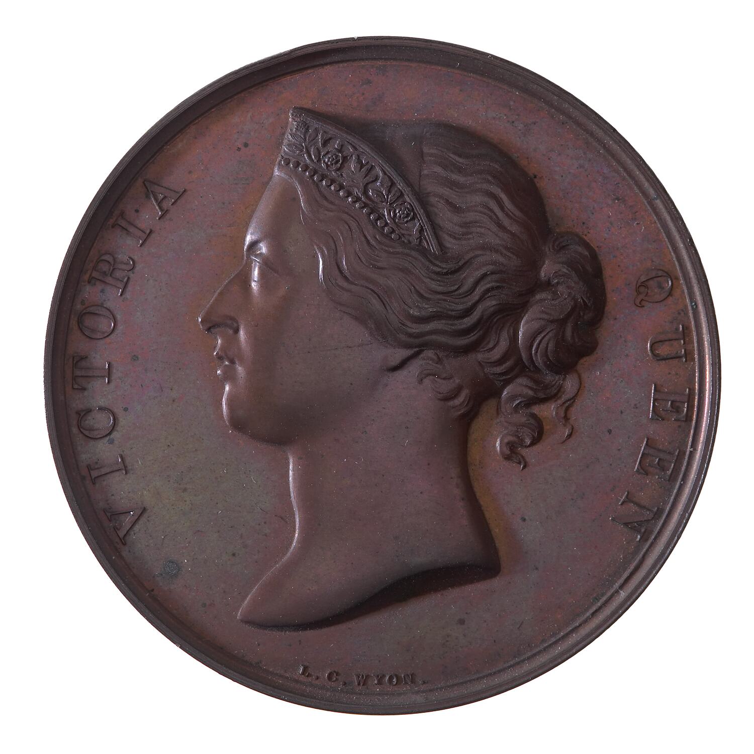 At centre, young head of Queen Victoria wearing coronet facing left; around, VICTORIA QUEEN below in small letters the artist's name, L.C.WYON.