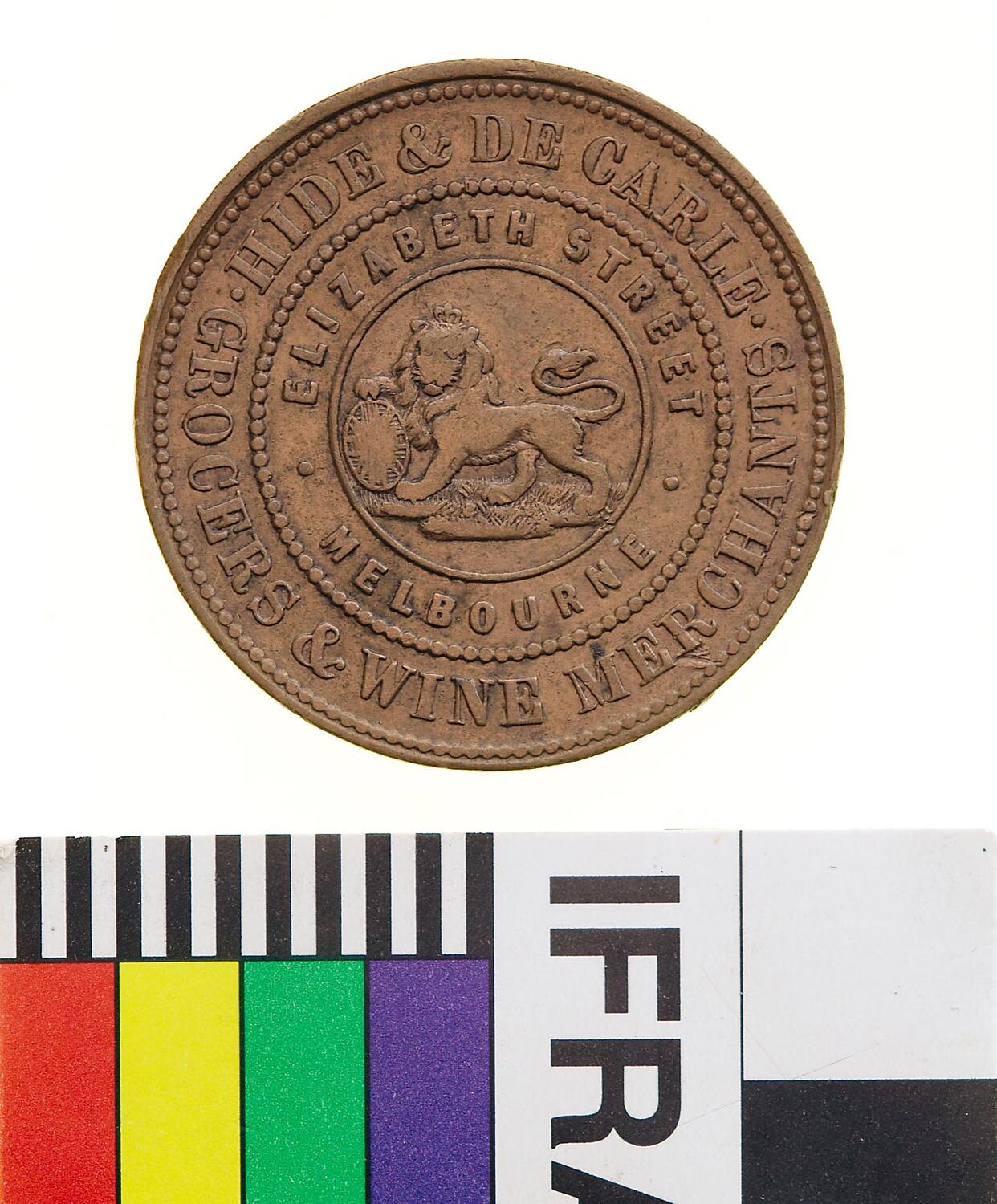 Obverse: HIDE & DE CARLE. GROCERS & WINE MERCHANTS ELIZABETH STREET MELBOURNE Reverse: MELBOURNE, VICTORIA. 1857