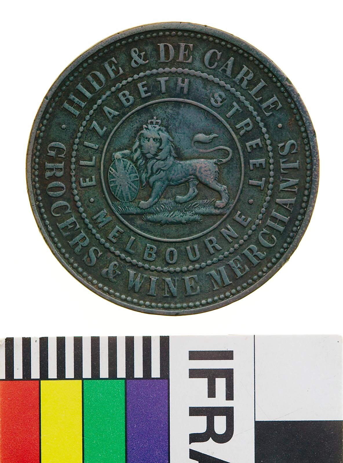 At centre within two concentric rings of text devided by a beaded circle, a male lion standing to left with head crowned facing front, its right paw is raised and rests on a shield bearing the Union Jack, its tail curved back over its body. Around, .HIDE & DE CARLE. GROCERS & WINE MERCHANTS / . ELIZABETH STREET . MELBOURNE