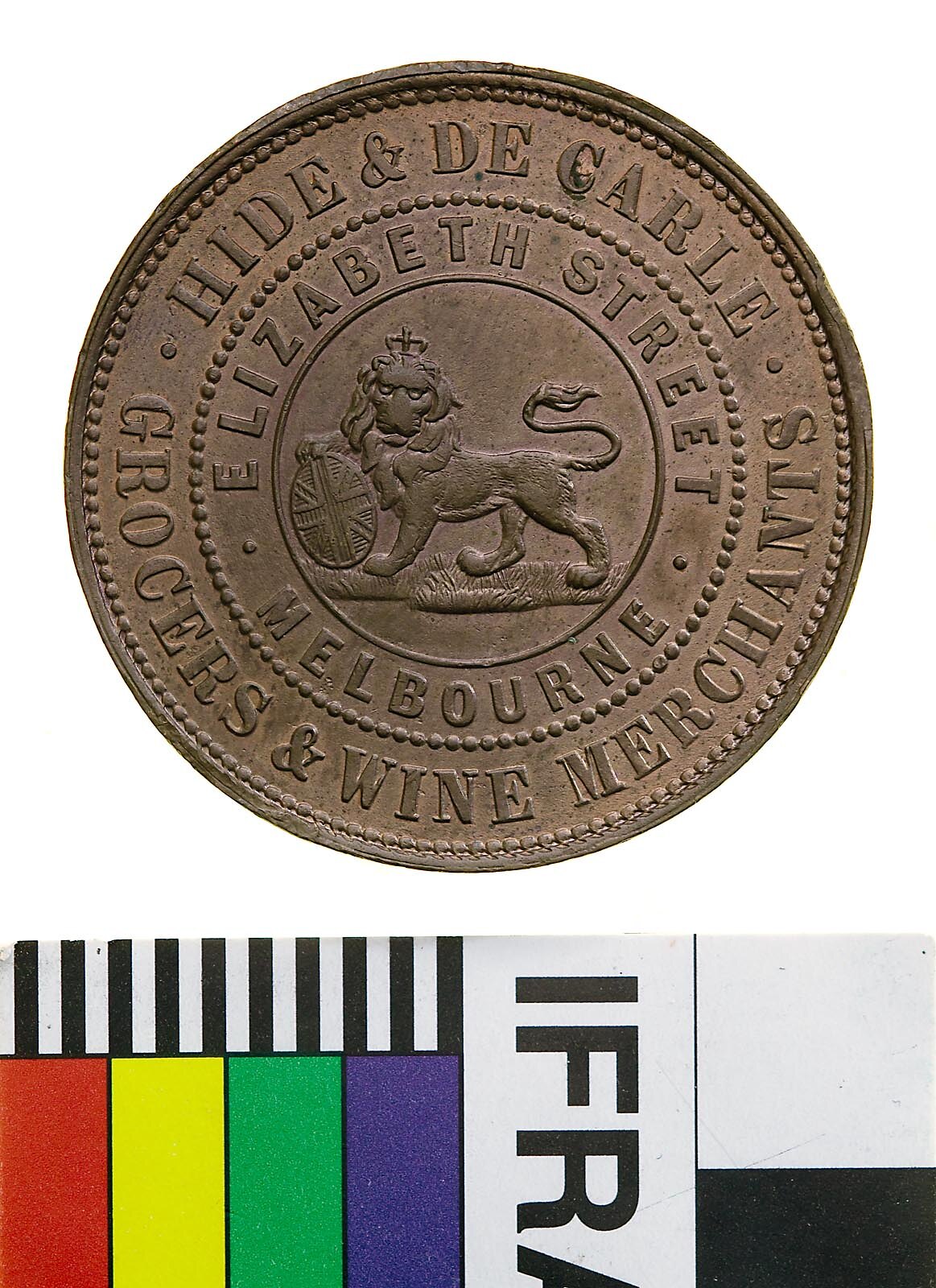 Obverse: HIDE & DE CARLE. GROCERS & WINE MERCHANTS ELIZABETH STREET MELBOURNE Reverse: MELBOURNE, VICTORIA. 1858