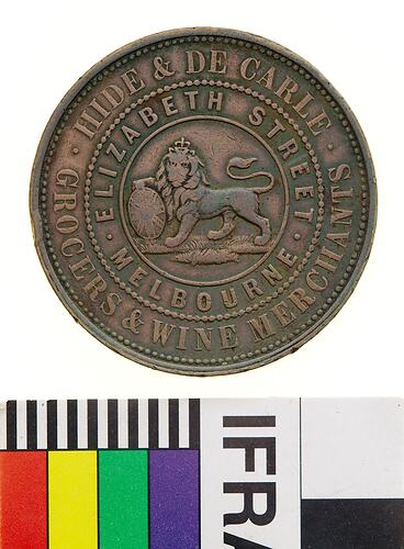 A round copper token (34 mm diameter) giving the name address and business of the issuer: Hide & De Carle, Elizabeth St. Melbourne, Grocers and wine merchants.. The token features at centre of the obverse a male lion standing to left with head crowned facing front, its right paw is raised and rests on a shield bearing the Union Jack, its tail curved back over its body. On the reverse a female figure representing Justice seated on a wool bale with legs to left but her head and upper body to front. A wine barrel lies on the ground behind her, its end decorated with a cross to hint at a Union Jack (as found beside Britannia on the copper coins of the period). A three-masted sailing ship sails to the right on the horizon to the left. Justice wears a blindfold and extends a balanced set of scales with her right hand. With her left she holds an inverted cornucopia from which fruits flow onto the ground. She wears an ancient-style of flowing dress bound at the waist, her left arm bare and right draped to near the elbow. It bears the date 1858. This token has been cleaned and the obverse has re-toned.