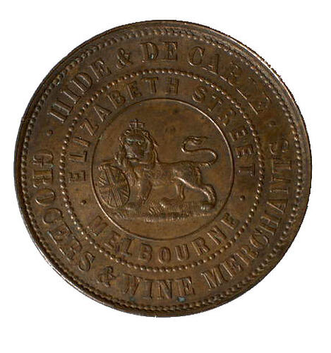 A round copper token (34 mm diameter) giving the name address and business of the issuer: Hide & DeCarle, Elizabeth St. Melbourne, Grocers and wine merchants.. The token features at centre of the obverse a male lion standing to left with head crowned facing front, its right paw is raised and rests on a shield bearing the Union Jack, its tail curved back over its body. On the reverse a female figure representing Justice seated on a wool bale with legs to left but her head and upper body to front. A wine barrel lies on the ground behind her, its end decorated with a cross to hint at a Union Jack (as found beside Britannia on the copper coins of the period). A three-masted sailing ship sails to the right on the horizon to the left. Justice wears a blindfold and extends a balanced set of scales with her right hand. With her left she holds an inverted cornucopia from which fruits flow onto the ground. She wears an ancient-style of flowing dress bound at the waist, her left arm bare and right draped to near the elbow. It bears the date 1858.