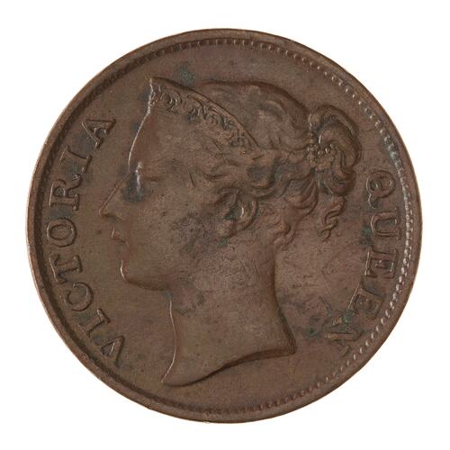 Head of the Queen wearing coronet or diadem ornamented with a scroll facing left; around, VICTORIA QUEEN. The ends of the coronet are connected by a band which is partly hidden by the hair. The hair is drawn into a knot decorated with beads behind the head.