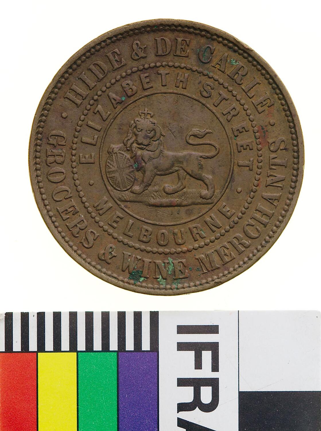 A round copper token (34 mm diameter) giving the name address and business of the issuer: Hide & De Carle, Elizabeth St. Melbourne, Grocers and wine merchants.. The token features at centre of the obverse a male lion standing to left with head crowned facing front, its right paw is raised and rests on a shield bearing the Union Jack, its tail curved back over its body. On the reverse a female figure representing Justice seated on a wool bale with legs to left but her head and upper body to front. A wine barrel lies on the ground behind her, its end decorated with a cross to hint at a Union Jack (as found beside Britannia on the copper coins of the period). A three-masted sailing ship sails to the right on the horizon to the left. Justice wears a blindfold and extends a balanced set of scales with her right hand. With her left she holds an inverted cornucopia from which fruits flow onto the ground. She wears an ancient-style of flowing dress bound at the waist, her left arm bare and right draped to near the elbow. It bears the date 1858.