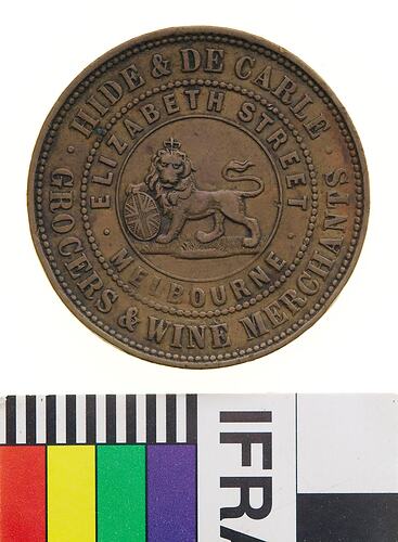 A round copper token (34 mm diameter) giving the name address and business of the issuer: Hide & De Carle, Elizabeth St. Melbourne, Grocers and wine merchants.. The token features at centre of the obverse a male lion standing to left with head crowned facing front, its right paw is raised and rests on a shield bearing the Union Jack, its tail curved back over its body. On the reverse a female figure representing Justice seated on a wool bale with legs to left but her head and upper body to front. A wine barrel lies on the ground behind her, its end decorated with a cross to hint at a Union Jack (as found beside Britannia on the copper coins of the period). A three-masted sailing ship sails to the right on the horizon to the left. Justice wears a blindfold and extends a balanced set of scales with her right hand. With her left she holds an inverted cornucopia from which fruits flow onto the ground. She wears an ancient-style of flowing dress bound at the waist, her left arm bare and right draped to near the elbow. It bears the date 1858.