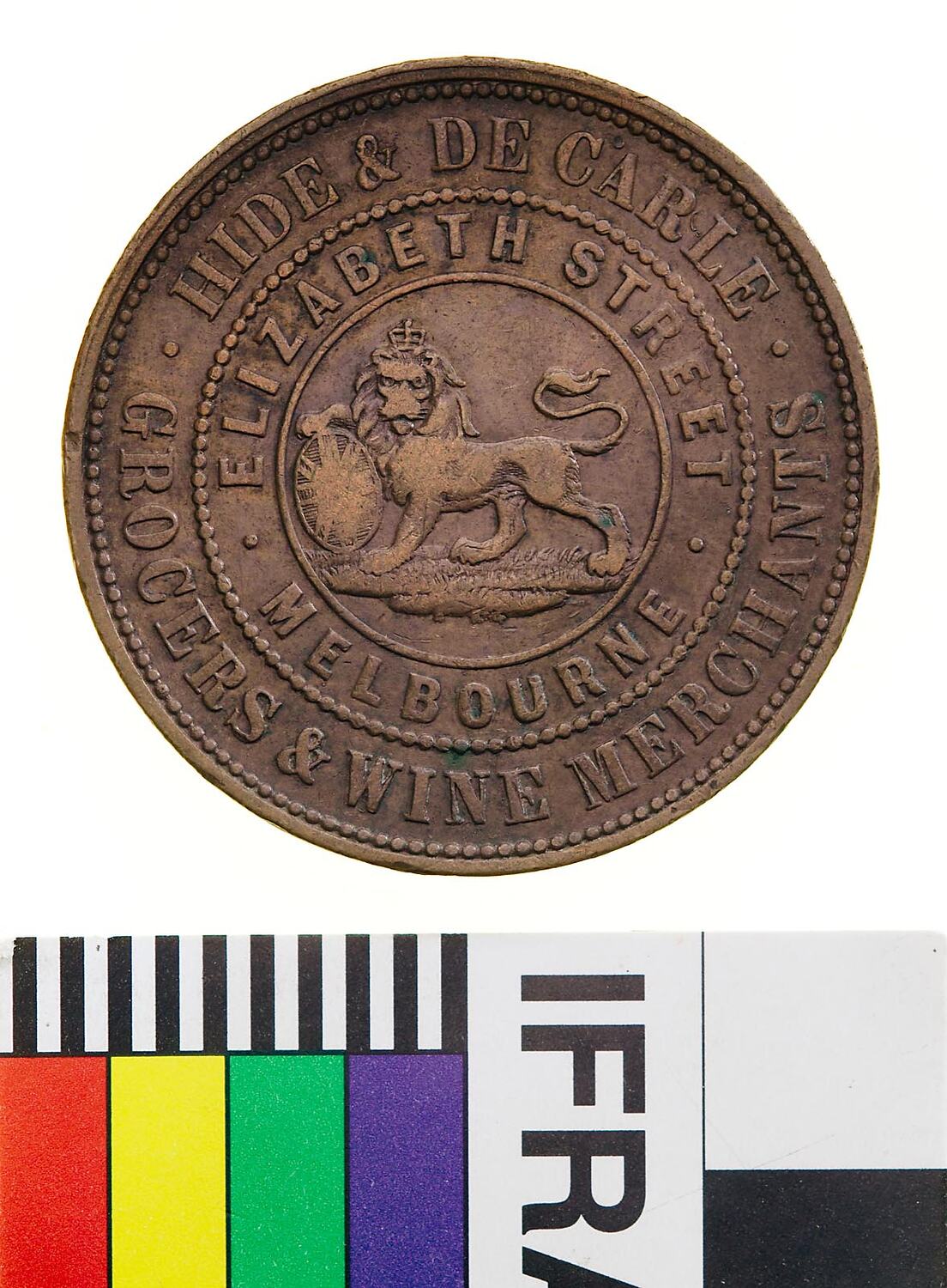 At centre within two concentric rings of text devided by a beaded circle, a male lion standing to left with head crowned facing front, its right paw is raised and rests on a shield bearing the Union Jack, its tail curved back over its body. Around, .HIDE & DE CARLE. GROCERS & WINE MERCHANTS / . ELIZABETH STREET . MELBOURNE