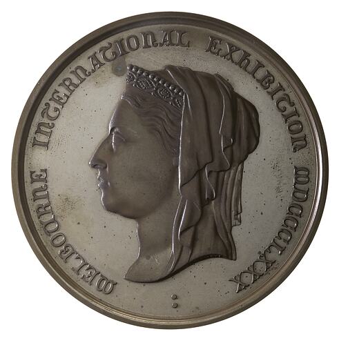 Head of Queen Victoria, wearing small crown and veil left; around, MELBOURNE INTERNATIONAL EXHIBITION MDCCCLXXX .