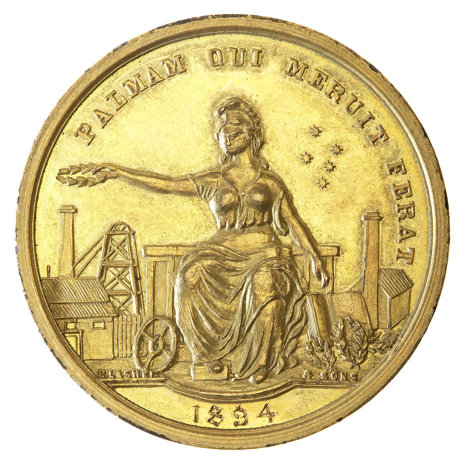 Obverse: "PALMAM QUI MERUIT FERAT"; In the exergue: "1894" (engraved); "BLASHKI & SONS" in the field above the exergue Reverse: "EXHIBITION OF MINING MACHINERY / . VICTORIA ." around edge; " FIRST / AWARD" in centre shield.