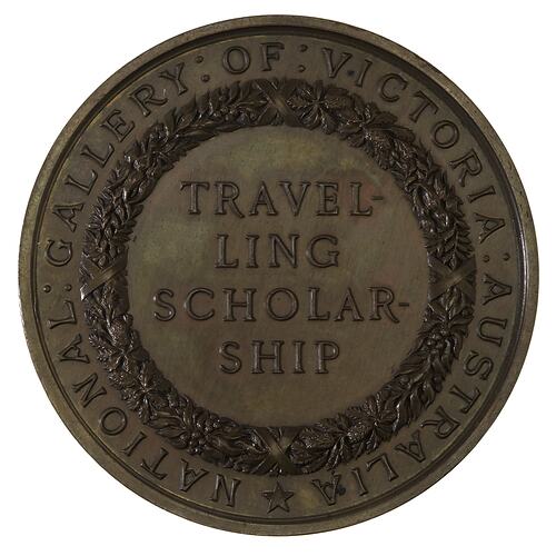 At centre within closed floral wreath, TRAVEL- / LING / SCHOLAR- / SHIP; around, NATIONAL : GALLERY : OF : VICTORIA : AUSTRALIA *