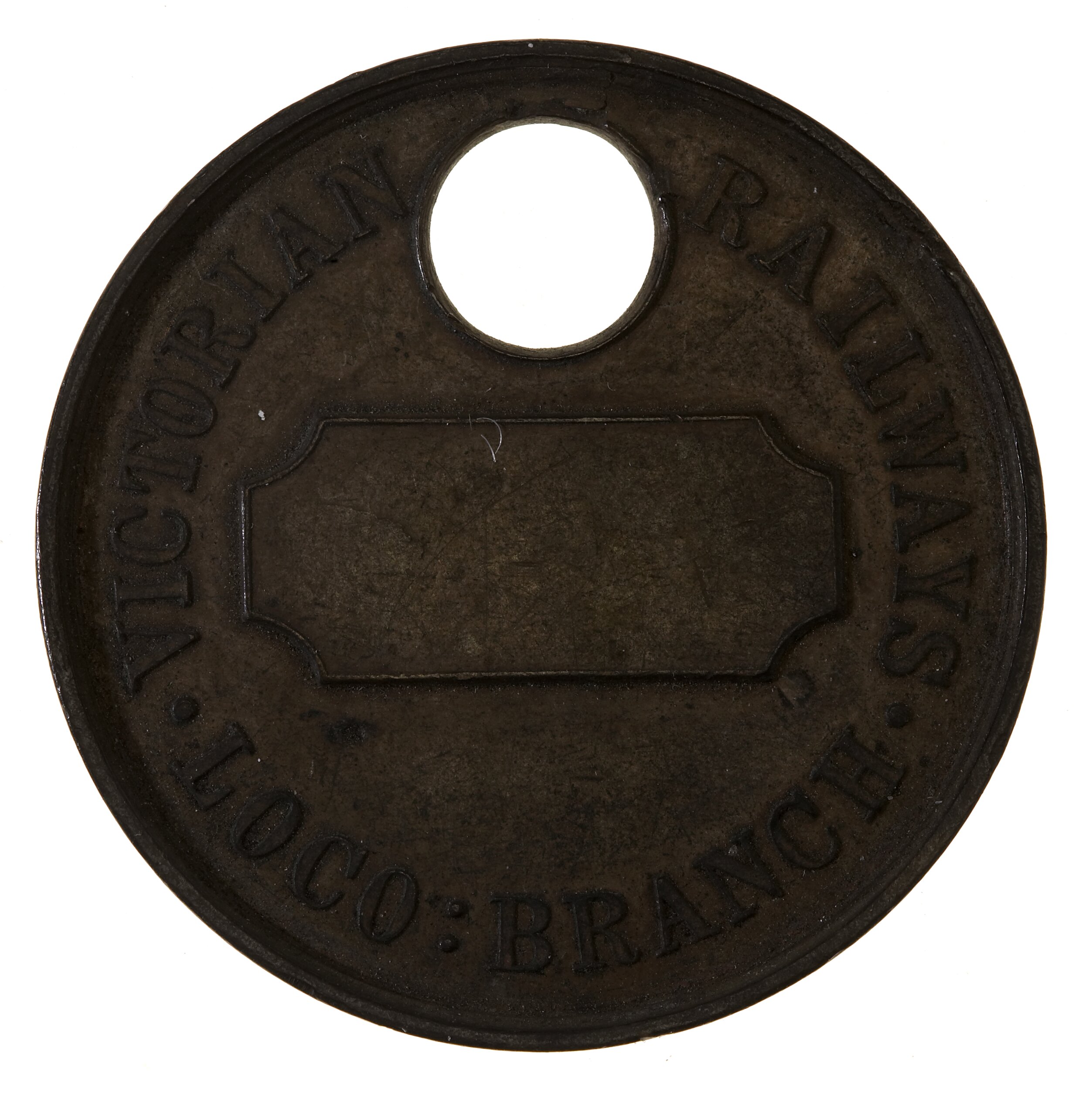 At centre a plaque on which a worker's number would be stamped (this piece not stamped); around, .VICTORIAN RAILWAYS. LOCO:BRANCH