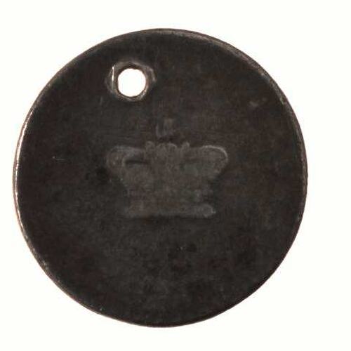 A circular silver coin (19 mm diameter with milled edge) bearing on the obverse a crown with the words around above, NEW SOUTH WALES; and the date below, 1813. The reverse featured the denomination FIFTEEN PENCE in two lines seperated by the engraver's initial H ( on this example, wear has removed most of the lettering and it has been holed above the top left side of the crown)