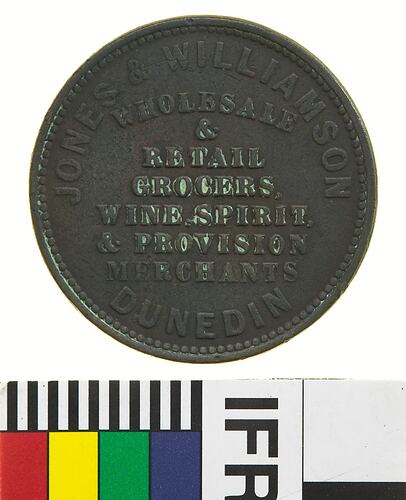 Obverse: JONES & WILLIAMSON WHOLESALE & RETAIL GROCERS, WINE, SPIRIT & PROVISION MERCHANTS DUNEDIN Reverse: NEW ZEALAND 1858