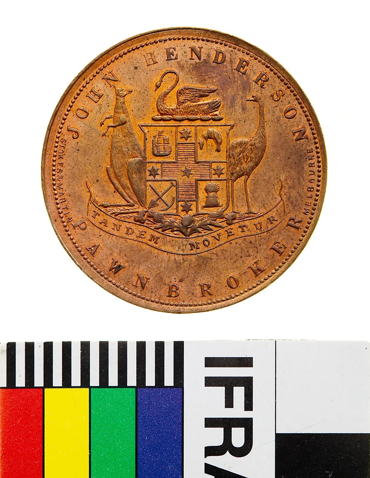 At centre a coat of arms with a swan as crest and kangaroo and emu supporters. The shield is quartered by a cross with a star at the centre and at the end of each arm, top left, three-masted sailing ship, top right, golden fleece, lower left, crossed pick and spade, lower right, wheat-sheaf. The shiels is set above a bouquet of rose, thistle and shamrock set above a ribbon with the Latin motto TANDEM MOVETUR. Around above, JOHN HENDERSON; below, PAWNBROKER; in tiny letters on either side the makers name, STOKES & MARTIN MELBOURNE