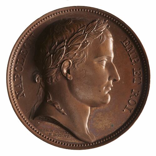 Laureate head of Napoleon facing right, around, NAPOLEON EMP. ET ROI.; on neck truncation in small lettering, DROZ FECIT.; below, DENON DIREXI / M . DCCC. VI.