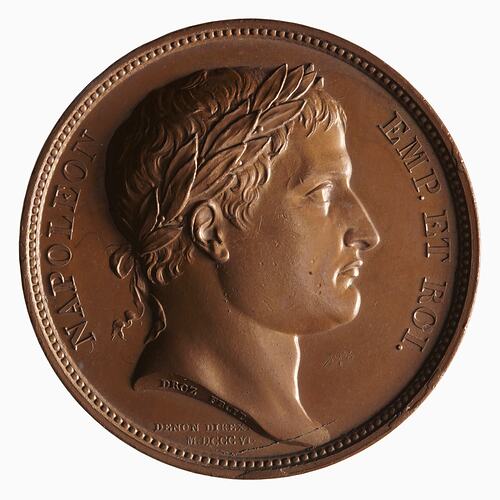 Laureate head of Napoleon facing right, around, NAPOLEON EMP. ET ROI.; on neck truncation in small lettering, DROZ FECIT. below, DENON DIREXIT / M. DCCC VI.