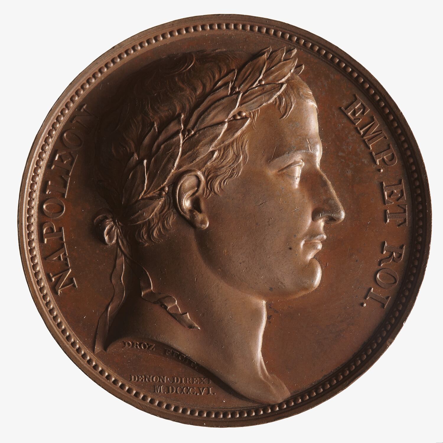 Laureate head right; around NAPOLEON EMP ET ROI.; on head truncation, DROZ FECIT; below in small letters, DENON DIREXI / M.DCCCVI. (without die crack)
