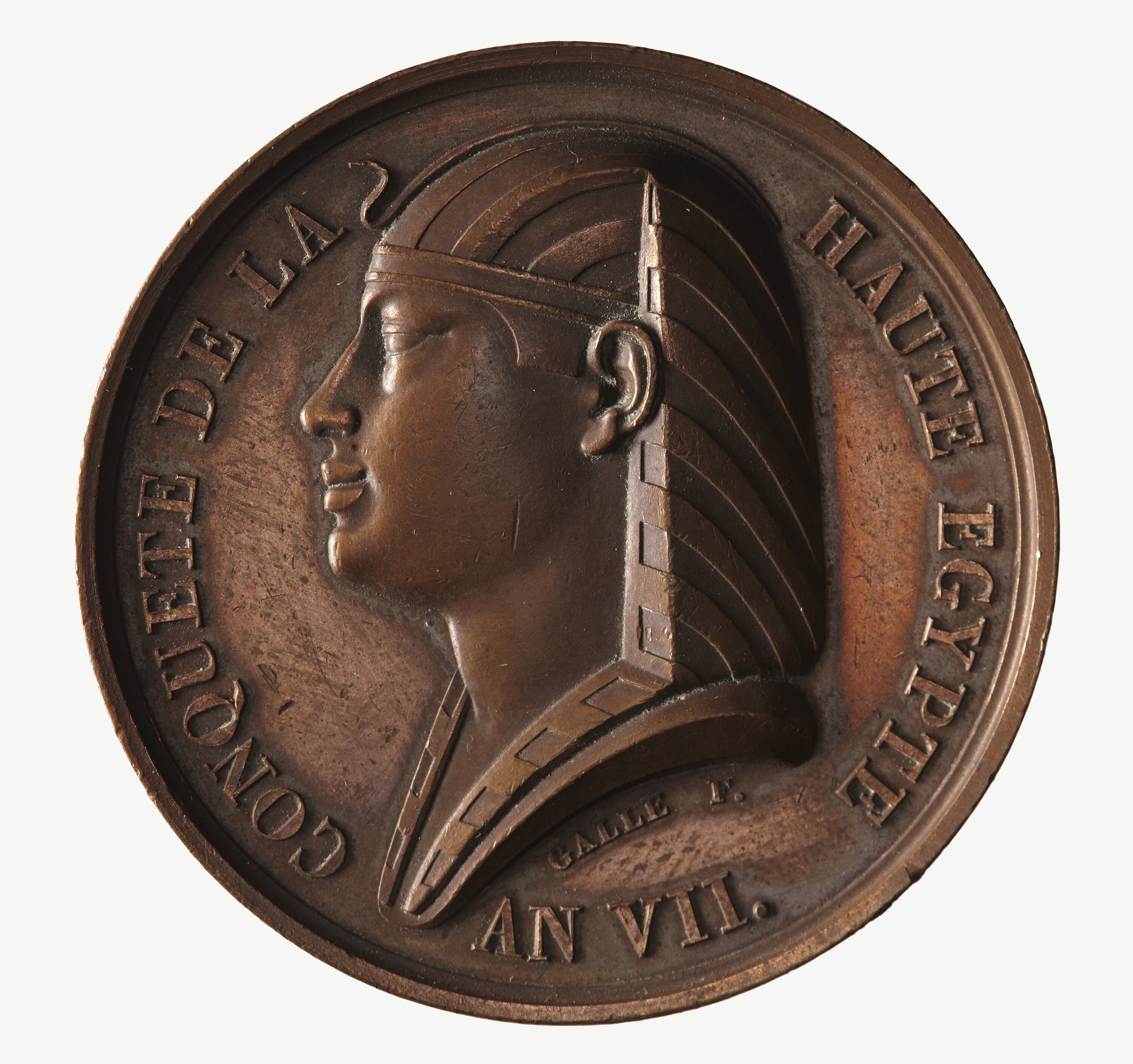 Bust of Memnon facing left; around, CONQUETE DE LA HAUTE EGYPTE AN. VII Below bust in small letters, GALLE F.