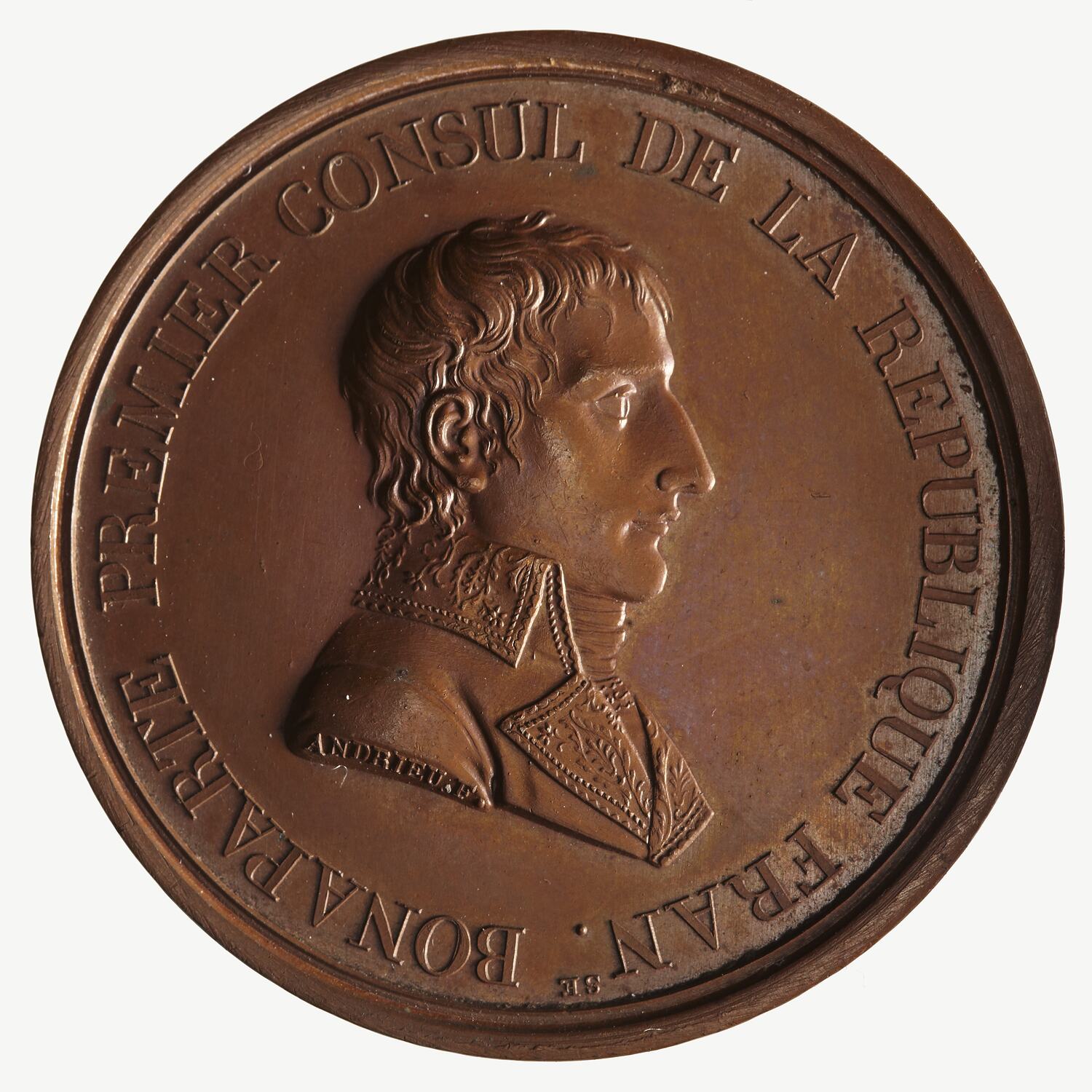 Bust of Bonaparte, head bare, facing right; around, BONAPARTE PREMIER CONSUL DE LA REPUBLIQUE FRANSE.; on bust truncation, ANDRIEU F.
