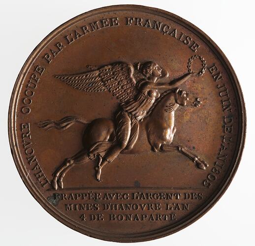 Victory on horseback racing to right extending a wreath with right hand and holding to the neck of the horse with her left; text around, L'HANOVER OCCUPE PAR L'ARMEE FRANCAISE EN JUIN DE L'AN 1803; in exergue, FRAPPEE AVEC L'ARGENT DES / MINES D'HANOVRE L'AN / 4 DE BONAPARTE'.