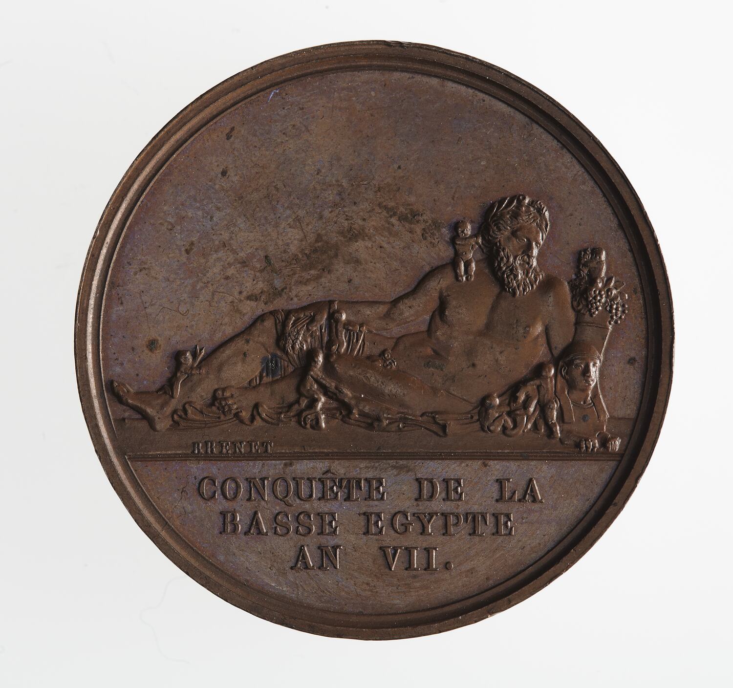Nile reclining left in chains with left arm resting on the Sphinx, cornucopia behind; Children (representing the main tributaries of the Nile) play over the river-god, one with an alligator; on ground in small letters, BRENET; in exergue, CONQUETE DE LA / BASSE EGYPTE / AN VII