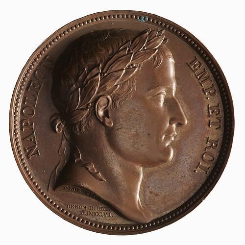Laureate head of Napoleon facing right, around, NAPOLEON EMP. ET ROI.; on neck truncation in small lettering, DROZ FECIT.; below, DENON DIREXI / M . DCCC . VI.