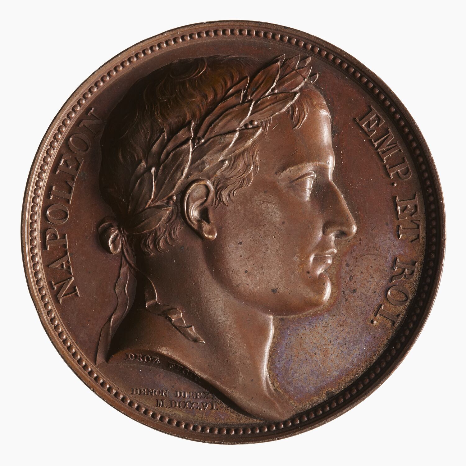 Laureate head of Napoleon facing right; around, NAPOLEON EMP ET ROI; on neck truncation in small lettering, DROZ FECI, below, DENON DIREXI MDCCCVI. (without die crack)