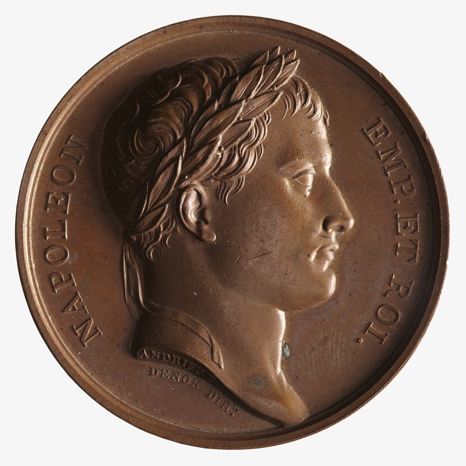 Laureate head facing right; around NAPOLEON EMP ET ROI.; on neck truncation, ANDRIEU F., in field below, DENON DIRT.