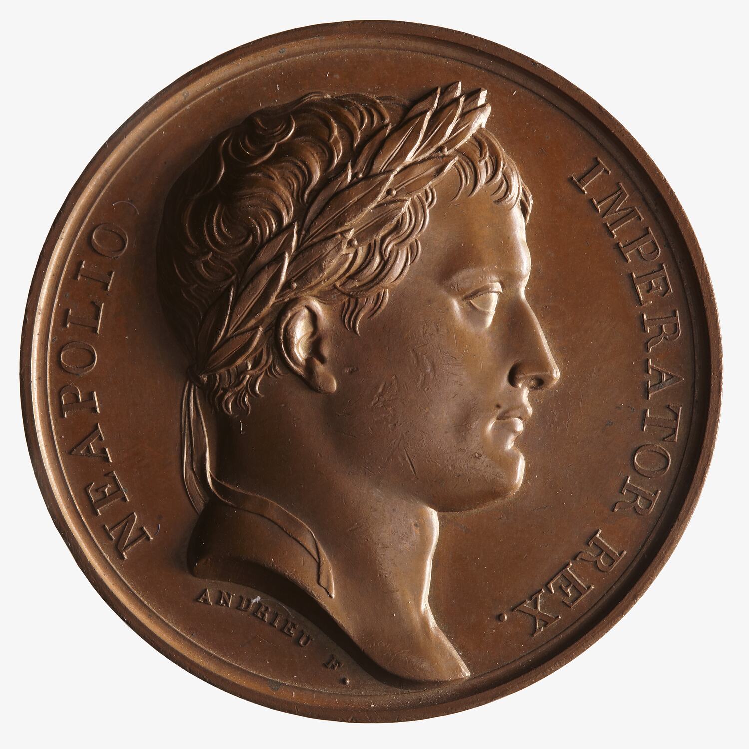 Napoleon in Roman armour on horseback charging to right and hurling thunderbolt at fallen warriors, an eagle flies above; around, BORVSSI DIDICERE NVPER.; in exergue, EXERCITV AD IENAM / DELETO XIV OCTOB. / M DCC VI; in field near rim at right in small lettering, ANDRIEU F.