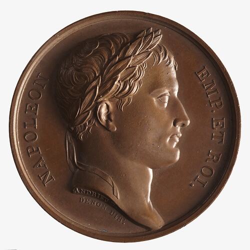 Laureate head facing right; around NAPOLEON EMP ET ROI.; on neck truncation, ANDRIEU F.; below, DENON DIRT.