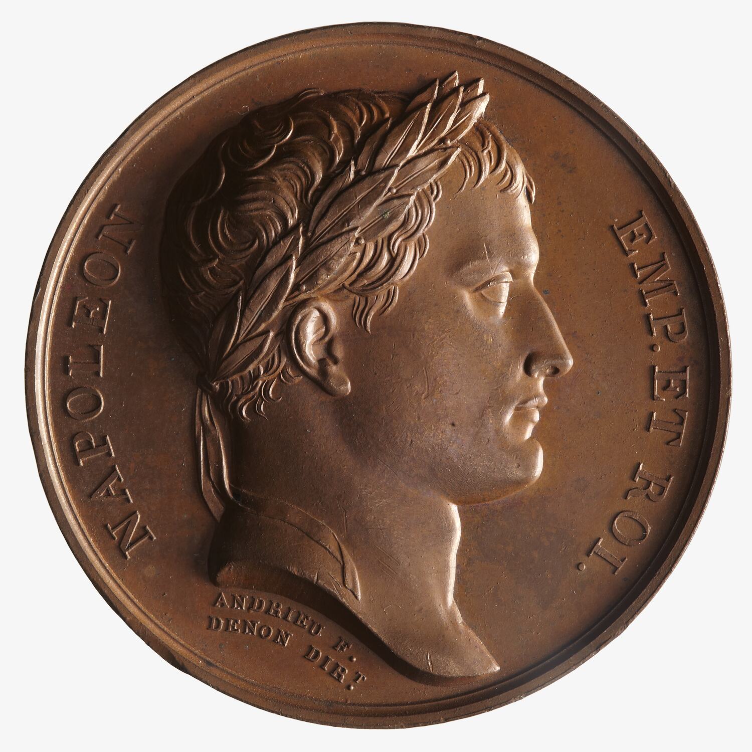 Laureate head facing right; around, NAPOLEON EMP ET ROI; below in small lettering, ANDRIEU F. / DENON DIRT.