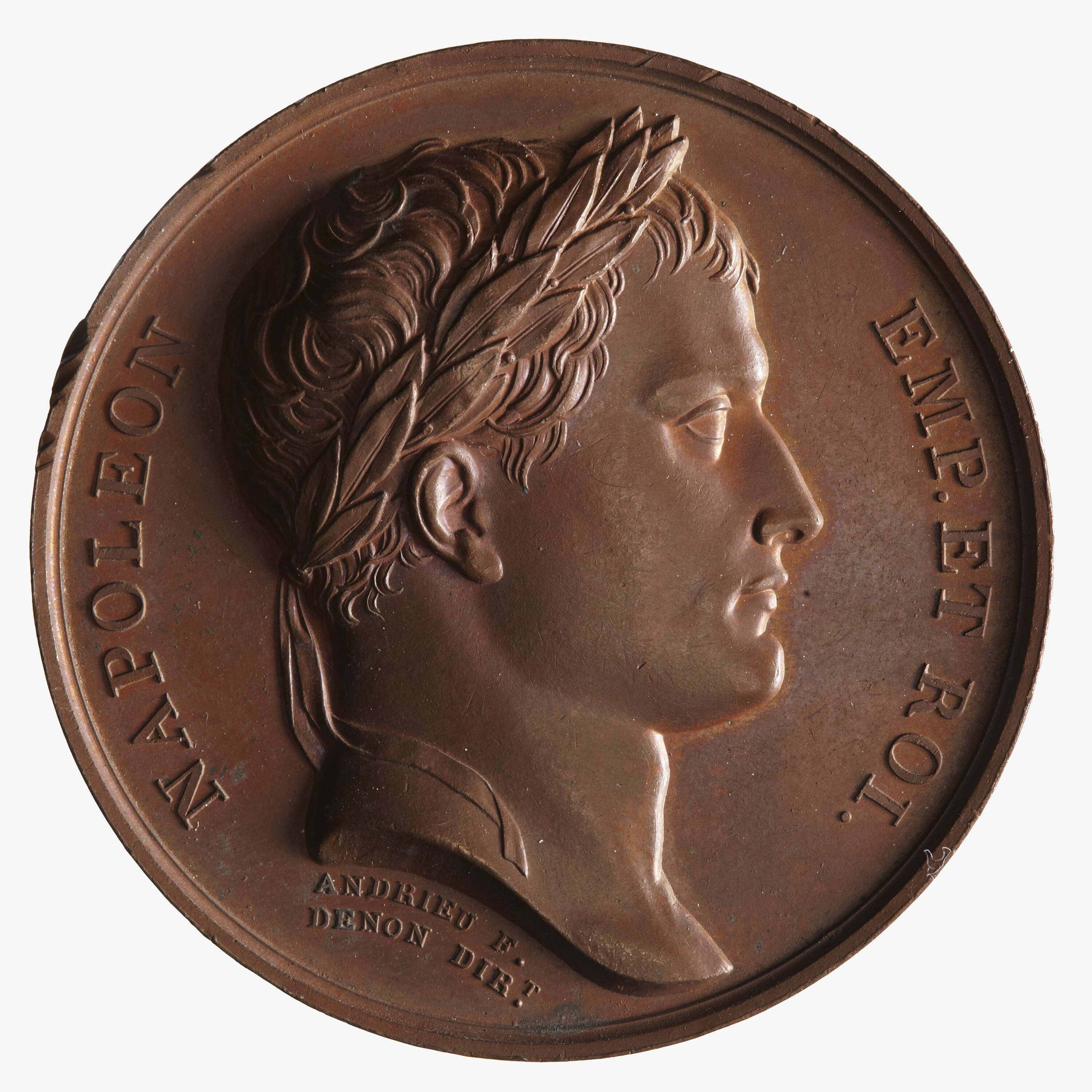 Laureate head facing right; around, NAPOLEON EMP. ET ROI.; below, ANDRIEU F. / DENON DIRT.
