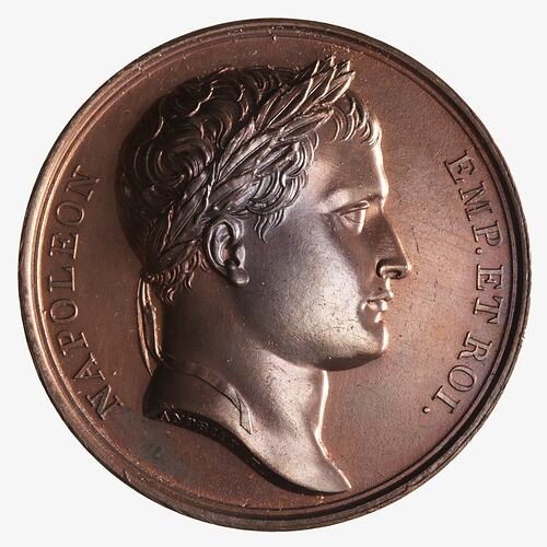Laureate head facing right; around, NAPOLEON EMP. ET ROI.; on neck truncation, ANDRIEU F.