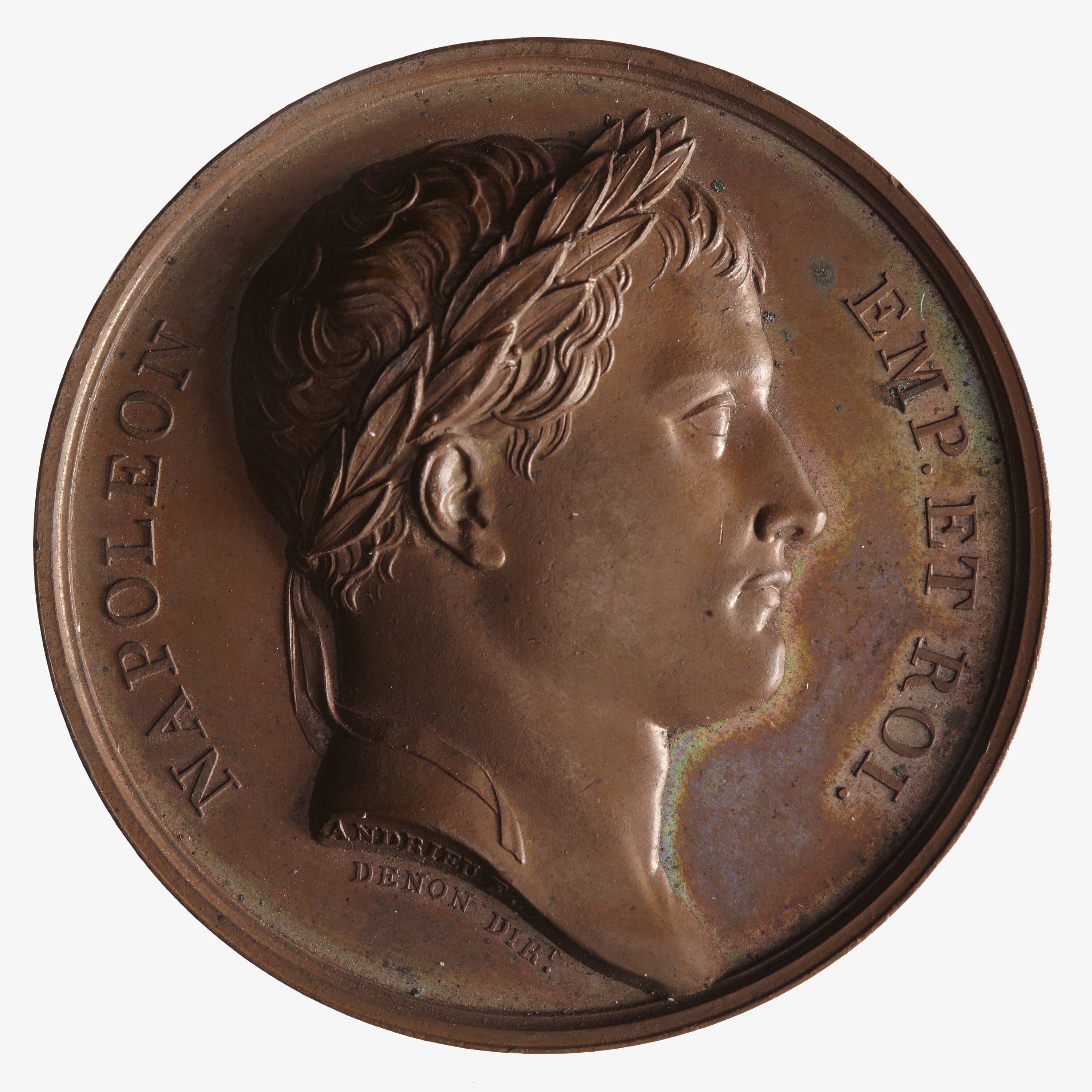 Laureate head facing right; around, NAPOLEON EMP. ET ROI.; on neck truncation, ANDRIEU F.; below, DENON DIRT.
