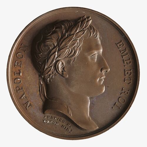 Laureate head facing right; around, NAPOLEON EMP. ET ROI.; below in small lettering, ANDRIEU F. / DENON DIRT.