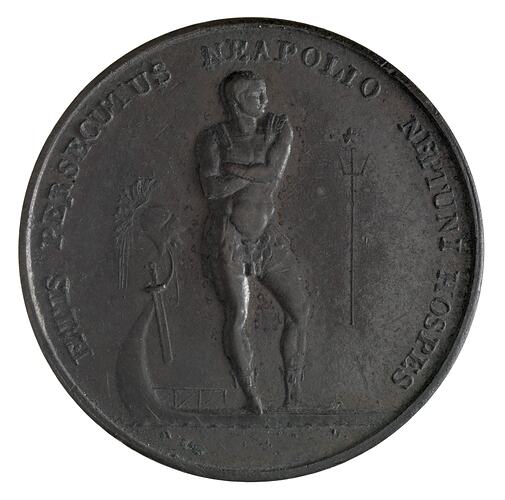 Round bronze medal. Obverse depicts Warrior standing on vessel with arms folded, his helmet and sword hung on the stern; in field right, a trident; inscription around. Reverse bears a legend in five lines: