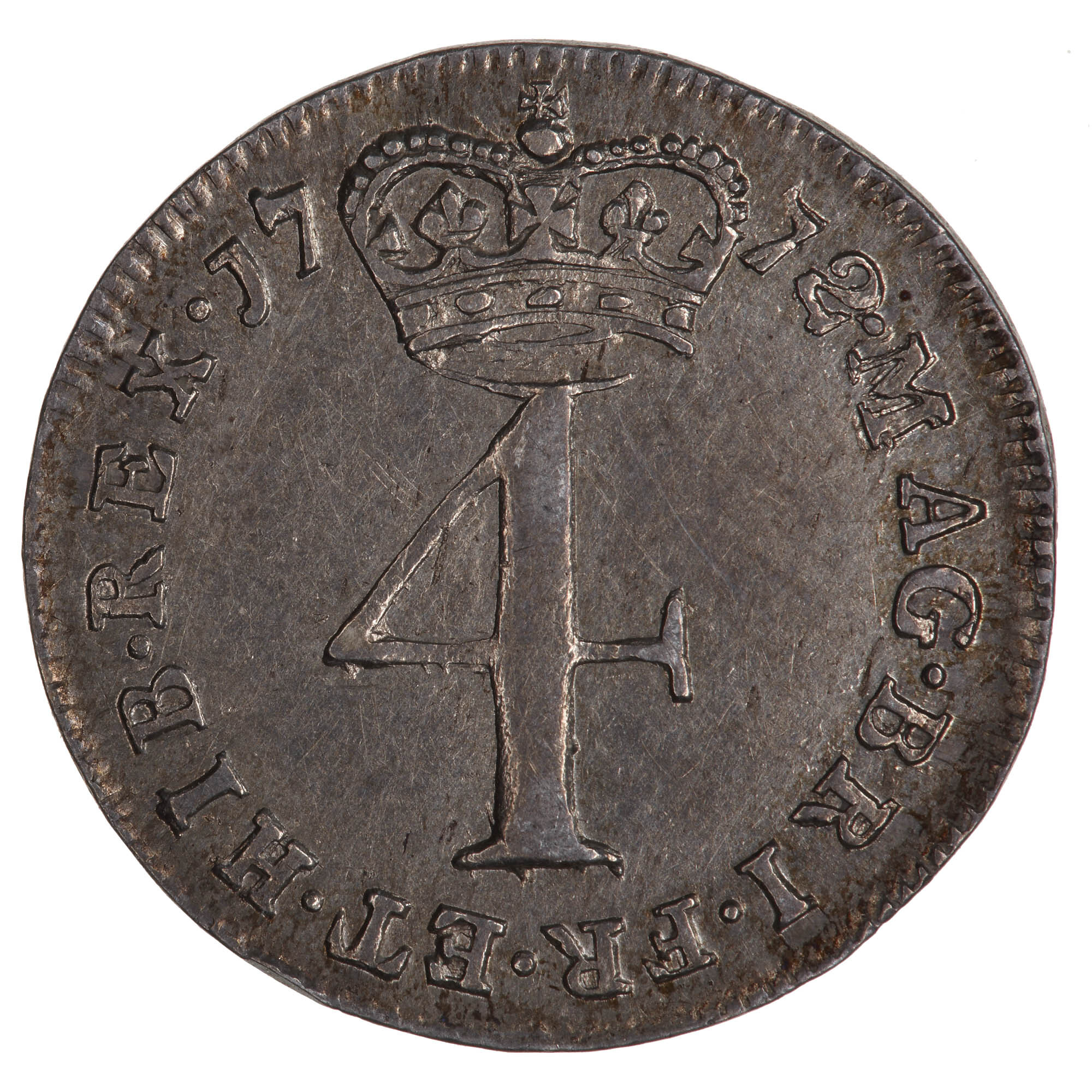 At centre a numeral 4 with crown above; around, MAG BRI FR ET HIB REX 1772 , the date being divided by the crown. 2 over 0