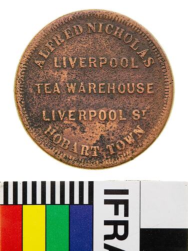 Copper one Penny Token, minted by an unknown British Mint, circa 1854. Issued by Alfred Nicholas, of the Liverpool Tea Warehouse, Hobart. Nicholas established a retail warehouse, offering goods such as sugar, brandy, ale and tobacco. He also took a keen interest in the colony's administration and was a member of the Tasmanian Legislative Assembly in 1858 and 1859, representing Hobart and Kingsborough.