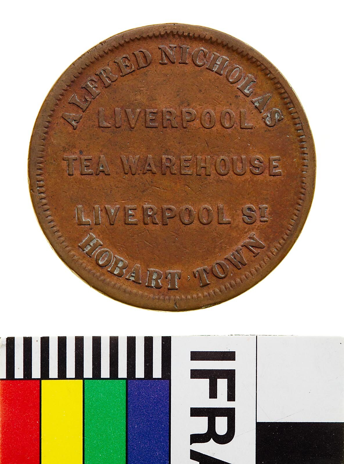 Obverse: ALFRED NICHOLAS LIVERPOOL TEA WAREHOUSE LIVERPOOL ST. HOBART TOWN Reverse: BRITANNIA