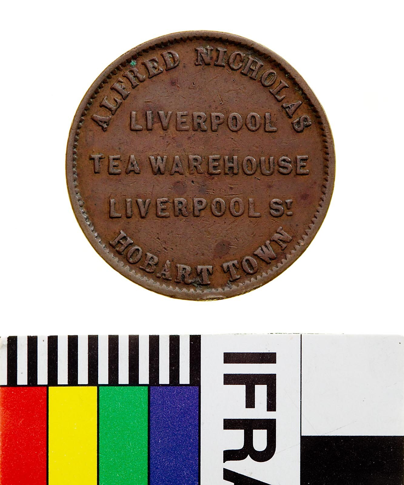 Obverse: ALFRED NICHOLAS LIVERPOOL TEA WAREHOUSE LIVERPOOL ST. HOBART TOWN Reverse: BRITANNIA