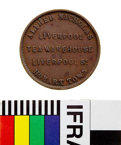 Copper Halfpenny Token, minted by an unknown British Mint, circa 1854. Issued by Alfred Nicholas, of the Liverpool Tea Warehouse, Hobart. Nicholas established a retail warehouse, offering goods such as sugar, brandy, ale and tobacco. He also took a keen interest in the colony's administration and was a member of the Tasmanian Legislative Assembly in 1858 and 1859, representing Hobart and Kingsborough.