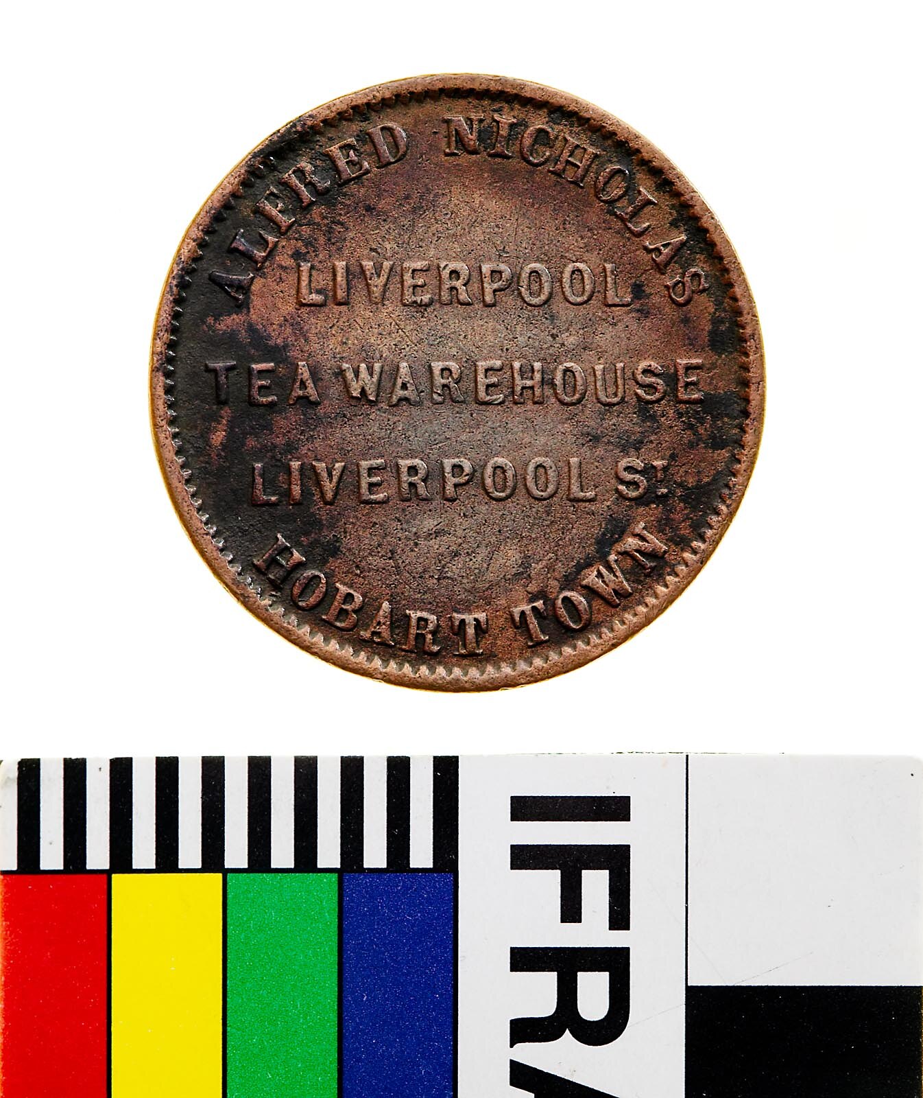 Obverse: ALFRED NICHOLAS LIVERPOOL TEA WAREHOUSE LIVERPOOL ST. HOBART TOWN Reverse: BRITANNIA
