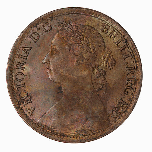 A farthing is a quarter penny. The bronze farthing replaced the earlier and larger copper farthing in 1860. This coin was current in all Australian colonies.