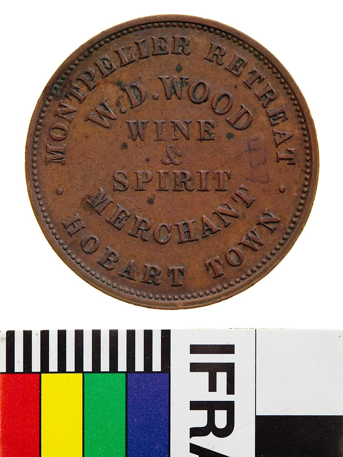 Obverse: W.D. WOOD WINE & SPIRIT MERCHANT MONTPELLIER RETREAT HOBART TOWN Reverse: HOBART TOWN 1855 MONTPELLIER RETREAT W.D.WOOD WINE MERCHANT